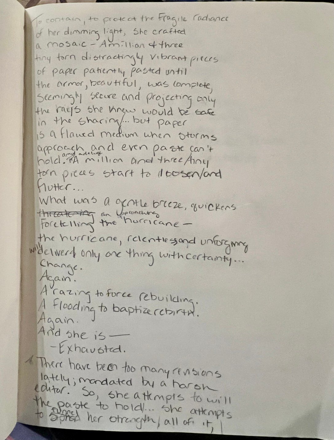 Diagnosis: Writing. I wasn’t writing. (I mean, there was the lack of exercise too, but, you know…) I wasn’t granting myself permission to do one of the few things that make me feel most myself. I was using the time excuse again. But, seriously, chasing time was part of the reason I was so breathless and I wasn’t getting any closer to catching him. The rock was at the bottom of the hill again everyday and my Sisyphean struggle only seemed to intensify. So, I had to make a determination. I needed to challenge myself. I needed to fight my way out and that fight was going to have to include putting words on the page (digital or otherwise).