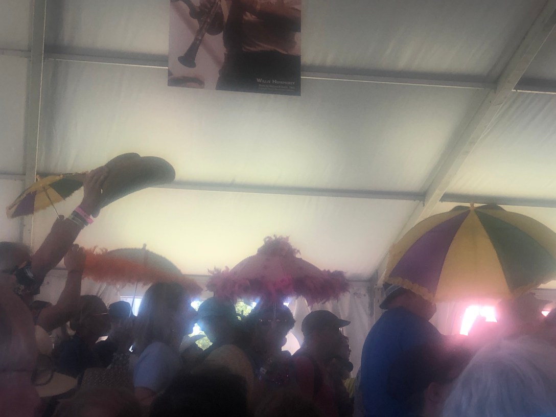 This shift ignited with a moment I’ve witnessed countless times in my Jazz Fest experience…the moment when the Economy Hall Jazz tent erupts from seated passivity into the undulating zeal of a Second Line. They marched; they strutted; they sashayed; they paraded; they danced. Some with eyes closed, others with eyes wide; there were smiles stretched wide, yet some others with brows furrowed as music overwhelmed their being; some with open hands waving high, others clasping an umbrella or napkin or hat for flair. I’ve come to expect this scene–honestly, if it wasn’t there, it wouldn’t feel like Jazz Fest at all. Yet today, somehow it appeared differently to me.